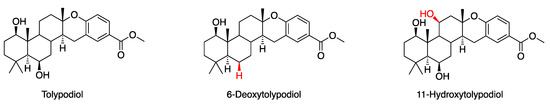 - Gurr, J.R.; O’Donnell, T.J.; Luo, Y.; Yoshida, W.Y.; Hall, M.L.; Mayer, A.M.S.; Sun, R.; Williams, P.G. 6-Deoxy- and 11-Hydroxytolypodiols: Meroterpenoids from the Cyanobacterium HT-58-2. J. Nat. Prod. 2020, 83, 1691–1695. [Google Scholar] [CrossRef] [PubMed]