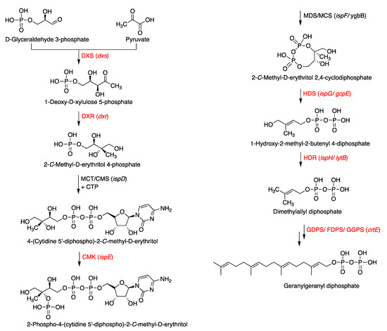 - Rohmer, M. Mevalonate-Independent Methylerythritol Phosphate Pathway for Isoprenoid Biosynthesis. Elucidation and Distribution. Pure Appl. Chem. 2003, 75, 375–387. [Google Scholar] [CrossRef]