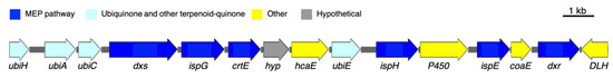To pursue the biosynthesis of tolypodiols, a search for BGCs related to terpenoids in the Nostocales HT-58-2 was performed (hereafter in this study, “HT-58-2” will refer to the cyanobacterium unless otherwise noted). The biosynthesis of the terpenoid skeleton in cyanobacteria proceeds via a non-mevalonate pathway, termed the methylerythritol-4-phosphate (MEP) pathway. The pathway is shown in Figure 4 [23,24]. Specific genes that encode enzymes involved in the MEP pathway were annotated throughout the genome of HT-58-2; the annotation was performed manually according to protein homology. A putative BGC of ~17 kbp with genes that encode almost the entire MEP pathway was found at 38,701–55,799 bp of the HT-58-2 genome (CP019636). Two of the requisite eight genes were absent, which coded for 2-C-methyl-D-erythritol 4-phosphate cytidylyltransferase (MCT) and 2-C-methyl-D-erythritol 2,4-cyclodiphosphate synthase (MDS), corresponding to the third and fifth steps, as shown in Figure 4. The two genes missing in the BGC, ispD and ispF, occur elsewhere in the genome. The other six genes in the MEP pathway, including dxs, dxr, ispE, ispG, ispH, and crtE, appear both in the BGC and at least once elsewhere distributed in the genome of HT-58-2 (Figure 5). This situation resembles that of the putative BGC for tolyporphins, where a subset of genes within the BGC-T also appear elsewhere in the genome.