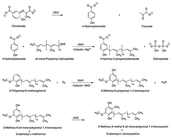 - Young, I.G.; Stroobant, P.; MacDonald, C.G.; Gibson, F. Pathway for Ubiquinone Biosynthesis in Escherichia coli K-12: Gene-Enzyme Relationships and Intermediates. J. Bacteriol. 1973, 114, 42–52. [Google Scholar] [CrossRef] [PubMed]