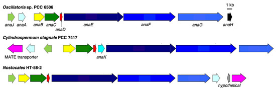 GenBank accession numbers for the anatoxin-a BGC from Oscillatoria sp. PCC 6506 are as follows: AnaJ (ACR33072), AnaA (ACR33073), AnaB (ACR33074), AnaC (ACR33075), AnaD (ACR33076), AnaE (ACR33077), AnaF (ACR33078), and AnaG (ACR33079).