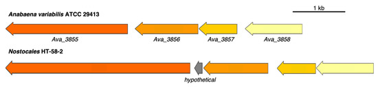 Alignment between shinorine BGCs from A. variabilis ATCC 29,413 and HT-58-2. Genes are color-coded to represent similarities.