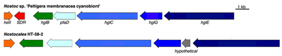 Heterocyst glycolipids (HGs) form a protective layer for oxygen-sensitive nitrogenase enzymes [50] in the envelope of heterocystous nitrogen-fixing cyanobacteria. The HT-58-2 cyanobacterium is filamentous and is capable of nitrogen fixation [9]; therefore, the presence of a BGC for HG biosynthesis in the genome of HT-58-2 seemed likely. Indeed, an HG BGC occurs in HT-58-2 at position 974,174–991,938 bp. Six genes therein encode proteins aligned with high similarity (>63% identity) to those of a reported BGC for HGs from Nostoc sp. ‘Peltigera membranacea cyanobiont’ [51]. The alignment of the two HG BGCs and the predicted product functions are shown in Figure 13 and Table 6. A short-chain dehydrogenase/reductase (SDR) is absent in the HG BGC from HT-58-2, while a carboxypeptidase regulatory-like domain protein is present between HglG and HglE. Adjacent to the assumed HG BGC are twelve photosynthesis and phycobilisome-related proteins, for which the relationship to the formation of HGs remains unknown. Overall, the putative HG BGC in HT-58-2 aligned with 85% similarity to the proteins of the Nostoc sp., although the effect of the absent SDR on the biosynthesis of HGs requires further study.