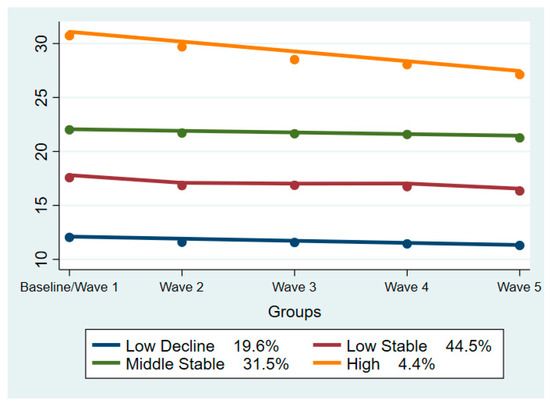 A four-group model of first polynomial order for groups one, three and four and cubic for group two presented the best BIC values. More information about the selection of the model is provided in the Appendix A. Trajectory lines were named to describe their baseline scores and shapes as High, Middle/Stable, Low/Stable, and Low/Decline. Overall, 19.6% of the participants were classified the Low/Decline trajectory, 44.5% to the Low/Stable group, 31.5% to the Middle/Stable group, and 4.4% were classified to the High group. Figure 1 depicts trajectory lines.