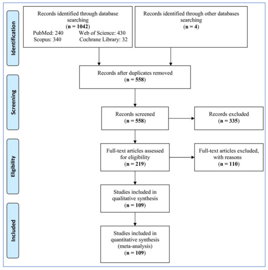 A total of 1046 records were retrieved from the databases (Figure 1). After removing duplicates, 558 records were screened; next, 339 records were excluded, and therefore 219 full text articles were evaluated for eligibility. Then, 110 full text articles were excluded for the following reasons (9 reviews. 4 meta-analyses. 39 articles had no control group or included control group with an AHI > 5 in adults. 3 articles included control group with an AHI > 1 in children. 1 article didn’t show AHI. 4 articles included groups under treatment. 4 articles included overlap data with other studies. 8 articles included OSA participations with other diseases. 17 articles included OSAS. 5 articles included less than 10 cases in one group or both groups (case or control groups). 3 letters to editor. 2 animal studies. 4 included participants with SDB. 2 articles didn’t include data. 1 book chapter. 4 articles reported irrelevant data). At last, 109 studies were selected for the analysis.