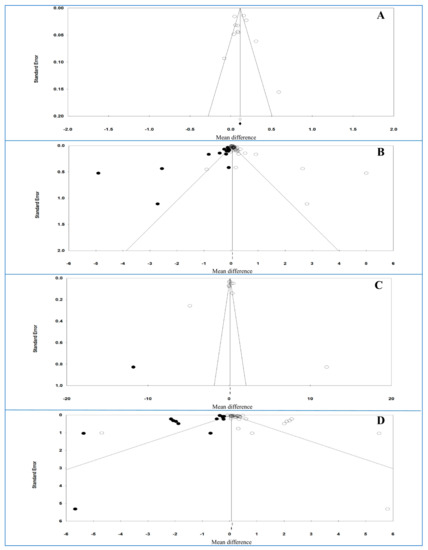 Funnel plot of analysis of high-sensitivity C-reactive protein (hs-CRP) (A: plasma and B: serum) and CRP levels (C: plasma and D: serum) in adult participants. Open circles represent observed studies. Black circles represent imputed studies. Open diamonds represent the pooled effects from the original studies. Black diamonds represent the pooled effects incorporating the imputed studies.
