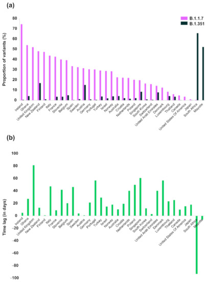 (a) Proportion of B.1.1.7 and B.1.351 in different countries based on the number of different genomes available in the GISAID database; (b) Time difference between the earliest variant sequence for B.1.1.7 versus the B.1.351 variants of concern (VOC).