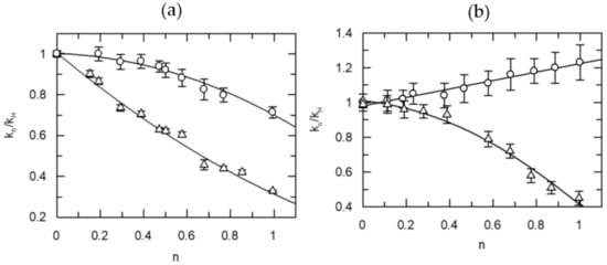 Proton inventory for the thrombin-catalyzed hydrolysis of, (a) left side, VPR7-AMC (N-t-Boc-Val-Pro-Arg-7-AMC) and, (b) right side, FPR-SFR in 0.02 M Tris buffer, pH 8.4 containing 0.3 M NaCl, 1% DMSO, 0.1% PEG-4000 at 26.0 ± 0.1 °C. Circles represent kcat/Km and triangles kcat. Curves were calculated from the best-fit models in Table 1, as introduced in Chart 1.