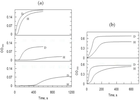 - Chang, T.K.; Chiang, Y.; Guo, H.-X.; Kresge, A.J.; Mathew, L.; Powell, M.F.; Wells, J.A. Solvent isotope effects in H2O-D2O mixtures (proton inventories) on serine-protease-catalyzed hydrolysis reactions. Influence of oxyanion hole interactions and medium effects. J. Am. Chem. Soc. 1996, 118, 8802–8807. [Google Scholar] [CrossRef]