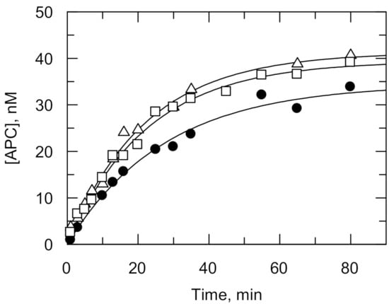 Solvent isotope effect for thrombin-catalyzed PC activation at pH 8.5, 0.02 M Tris, 0.30 M NaCl, 5 mM CaCl2, 0.1% PEG-4000, 100 nM TM, 13.1 nM thrombin and 37.0 ± 0.1 °C. Circles represent H2O buffer, triangles D2O buffer (n = 0.91) and squares H2O/D2O buffer (n = 0.45). The errors are smaller than the symbols.