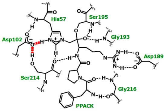 Proton bridges form at catalytic sites in the depth of these globular proteins to stabilize the TS. This stabilization of the TS occurs by 5–10 kcal/mol free energy provided by the acid-base catalytic machinery [,,,,,,], which consist of the catalytic triad, a Ser, a His and an Asp residue [,,,,,,,,,,]. Deuterium or tritium isotope effects, particularly deuterium KSIEs, proved to be great measures of the participation of protons in general acid-base catalysis by enzymes [,,,,,,,]. More in-depth information can be acquired from the proton inventory method to reveal the number and, to a degree, the nature of proton bridges at TSs [,,,,,,,,,,,,,,]. R. L. Schowen and his group championed the proton inventory technique since the 1980s to unravel the role of proton bridges in a variety of serine protease. On the basis of the results of these works, and others, they promoted an understanding that interactions between Sn (n = 1–3) specificity sub-sites and specific amino acids in substrates at corresponding Pn (n = 1–3) sites elicit a compression to affect contraction of the distances between proton donors and acceptors in the acid-base machinery. A consequence is the optimization of the pK of the attacking Ser195 nucleophile as it covalently attaches to the carbonyl C [,,]. Corroborating evidence of contraction of the critical proton bridges in the catalytic triad came from A. Frey’s group [,,,,] and others [,,,] by measuring 1H NMR signals of short strong hydrogen bonds (SSHBs) in a range of serine proteases covalently modified by TS analogs. Yet, other works with substrates and inhibitors demonstrated that P’ sites [,,,] and exosites [] in long peptide and protein substrates can have roles in exerting compression at the active site.