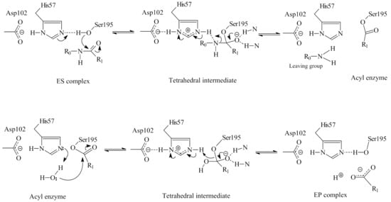 2.1. The Double Displacement Mechanism of Serine Protease Catalysis of Peptide/Protein Hydrolysis