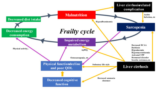 In general, when muscle strength and muscle mass decrease due to aging and other factors, the amount of activity decreases, and energy consumption declines [77]. In addition, a decrease in dietary intake leads to a state of malnutrition due to insufficient intake of protein and other nutrients. Persistent malnutrition leads to weight loss and loss of muscle strength and muscle mass. This vicious cycle (frailty cycle) increases the possibility of falls, fractures or worsening of chronic diseases that may lead to the need for nursing care [87]. The frailty cycle in LC patients is demonstrated in Figure 1.