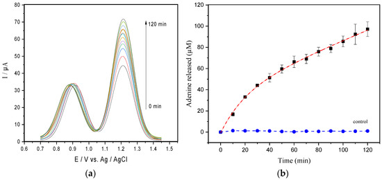 Aiming to evaluate the kinetic regime obtained with the proposed strategy with another approach, the determination of the released adenine was recorded for 120 min by HPLC. The unusual shape of the curves found for hsDNA catalysis by ricin from SWV was also confirmed by that approach (Figure S3, Supplementary Material). Although this unusual shape of the progress curves has been reported previously for DNA depurination by ricin [15,16,25], no kinetic characterization was reported at the authors’ best knowledge.