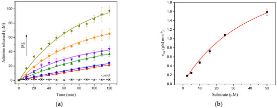 For measurements of product inhibition, 0–80 µM adenina were added to the activity assays. All the experiments were conducted in triplicate.