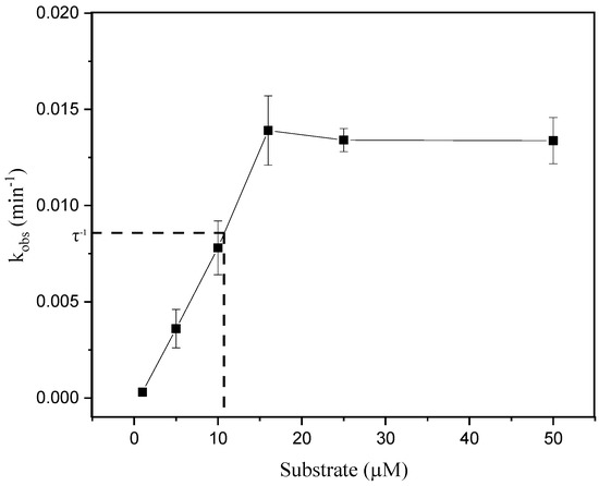 To confirm product inhibition taking place during hsDNA depurination, a diagnosis based on the variation of the value of kobs with the concentration of substrate was followed (Equation (1)). Changes in kobs with increasing hsDNA concentrations are shown in Figure 3. According to the data, the values of kobs < τ−1, where τ represents the time range of data acquisition, increase with the concentration of substrate, indicating a regime in which the inhibition of the product predominates [31]. However, values of kobs > τ−1, which tend to plateau with substrate increasing, indicate that the inhibition of the product and the depletion of the substrate contribute in a similar way to the degree of non-linearity observed in the kinetics of the enzymatic cycle.