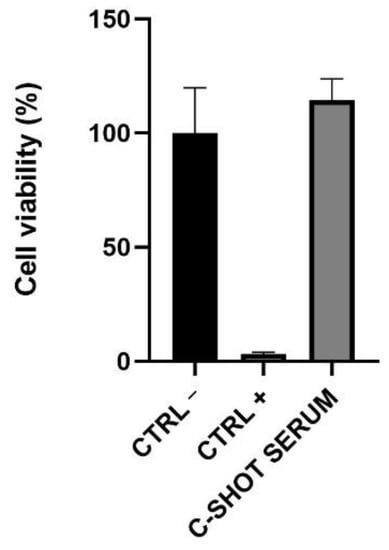 Cell viability on Reconstructed Human Epidermis (RHE). The inserts were treated with negative (Ctrl −, DPBS), positive (Ctrl +, SDS 5%) controls, and with the serum for 42 min. After 42 h of recovery, cell viability was assessed through an MTT assay.