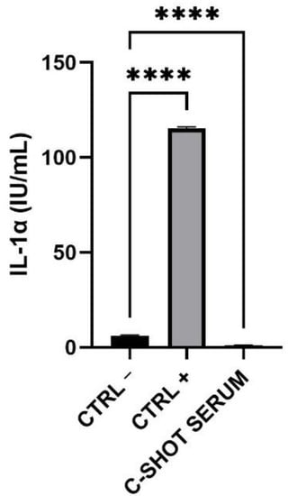 Expression of IL-1α (IU/mL) after treatment and 42 h of recovery of the RHE inserts with the negative (Ctrl −), positive (Ctrl +) controls and the serum. (n = 1, replicates = 4) **** p values ≤ 0.0001 were considered statistically significant compared to Ctrl −.