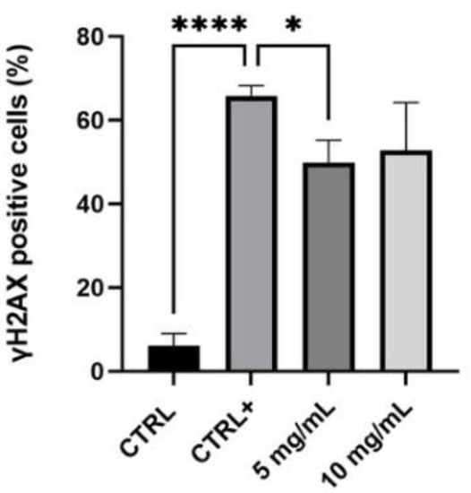 Quantification of γ-H2AX positive cells in control cells (Ctrl, untreated, and non-irradiated), positive control (Ctrl +, untreated, and irradiated cells) and in samples treated with the serum (5–10 mg/mL) (n = 2, replicates = 2) * p values ≤ 0.05 were considered statistically significant compared to positive control cells; **** p values ≤ 0.0001 were considered statistically significant compared to untreated cells.