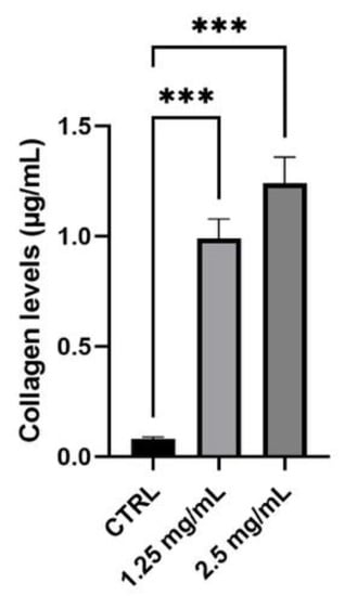 Collagen synthesis was quantified to evaluate anti-ageing cosmetic potential. To perform this assay, human dermal fibroblasts (NHDF) were used and 1.25 and 2.5 mg/mL were chosen as the highest non-cytotoxic concentrations with the best solubility in the medium. Considering Figure 6 and Table 7, graphic and data are reported as a concentration (μg/mL) with respect to untreated cells (Ctrl) on the NHDF cell line. A pre-treatment of 24 h with the tested serum induced a significant increase in collagen production of more than 10 times with both tested concentrations, confirming the excellent capacity of this cosmetic serum to contrast the natural and physiological skin-ageing effect.
