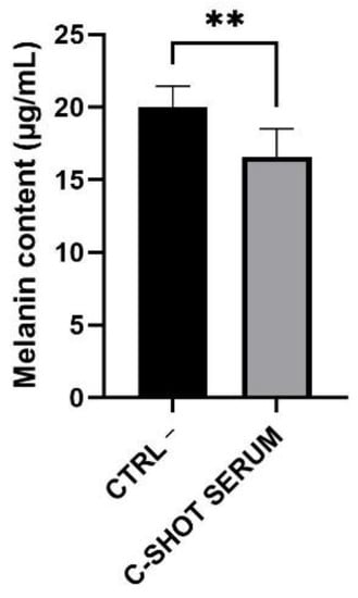 Melanin content (μg/mL) evaluated after four days of serum treatment of the tanned epidermis inserts compared to the untreated ones (negative control, Ctrl −) (n = 1, replicates = 4). ** p values ≤ 0.01 were considered statistically significant compared to untreated cells.