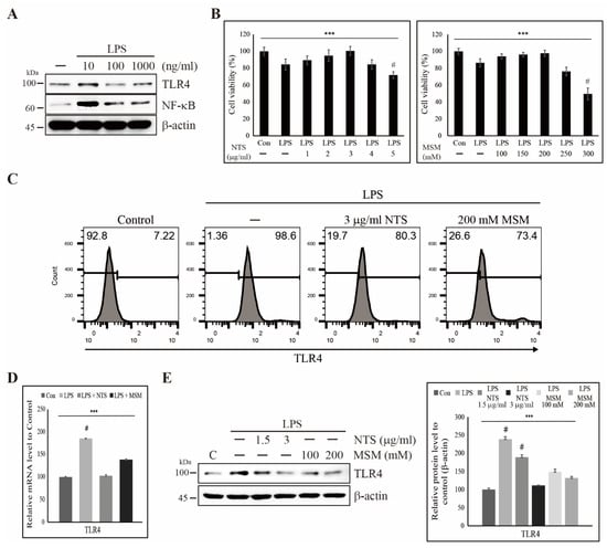 To evaluate the effect of LPS in human skin fibroblasts, CCD-986Sk, we first analyzed the dose-dependent activity of LPS. We found an increase in TLR4 and NF-κB with 10 ng/mL LPS, while higher concentrations of LPS reduced expression of TLR4 and NF-κB, perhaps being due to the induction of cell death (Figure 1A). We also analyzed cell death induced by LPS and sulfur compounds and found that the addition of LPS produced around 20% cell death, whereas lower concentrations of NTS and MSM provided cytoprotection against LPS-induced cell death. Cell viability increased with increasing NTS concentration to 3 µg/mL and MSM until 200 mM (Figure 1B). We hypothesize that this cytoprotective effect may help to inhibit inflammatory responses to LPS. Flow cytometry showed an increase in TLR4 expression in response to LPS, which was reversed by 3 µg/mL NTS or 200 mM MSM (Figure 1C). We evaluated the expression of TLR4 at the transcriptional and translational level and verified inhibition by 3 µg/mL NTS or 200 mM MSM at the transcript level (Figure 1D) and concentration-dependent inhibition of LPS-induced TLR4 protein expression (Figure 1E). These results suggest that sulfur compounds may be used for treatment against LPS-induced inflammation.