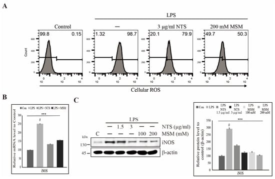 We observed a cytoprotective effect of NTS and MSM against LPS-induced cell death. We thus assumed that these sulfur compounds might inhibit LPS-induced ROS formation. Flow cytometry of cellular ROS supported our assumption, as 3 µg/mL NTS or 200 mM downregulated LPS-induced ROS formation (Figure 2A). ROS induction occurs due to the activation of iNOS, and to confirm the induction of iNOS, we analyzed mRNA and protein levels of iNOS expression. Analysis of iNOS expression at the transcript level showed an increase in iNOS expression in response to LPS treatment, inhibited by NTS or MSM treatment (Figure 2B). Protein and transcript expression analyses confirmed the dose-dependent inhibition of LPS-induced ROS production by NTS or MSM (Figure 2C). These results provide strong support for the cytoprotective effect of sulfur compounds.