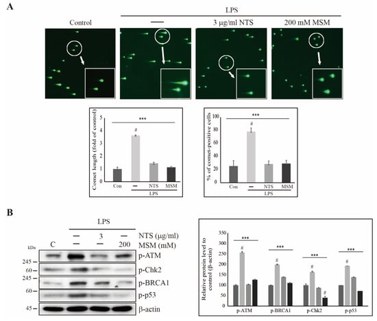 Prolonged ROS induction may lead to DNA damage. Thus, we used comet assays to explore whether LPS induces DNA damage and if sulfur compounds reverse these effects. Fluorescent microscopy showed an increase in comet length and number of comet-positive cells after LPS treatment, and these effects were reversed by 3 µg/mL NTS or 200 mM (Figure 3A). We analyzed the expression of molecular signals of DNA damage response (DDR). We observed increased expression of phosphorylated ataxia-telangiectasia mutated (ATM), checkpoint kinase 2 (Chk2), breast cancer 1 (BRCA1), and tumor protein 53 (p53), all of which are markers of DNA damage in the presence of LPS (Figure 3B). NTS and MSM significantly reduced the expression of these DNA damage response signals, indicating the ability of sulfur compounds to induce DDR in LPS-induced inflammation.