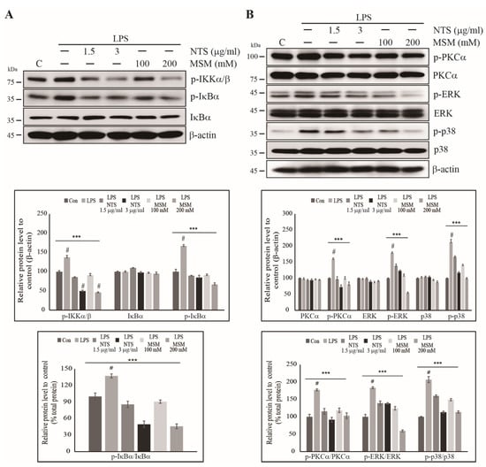 Sulfur compounds inhibited the LPS-induced canonical and PKC-dependent NF-κB pathways. (A) Western blotting analysis in CCD-986Sk cells treated with 1.5 and 3 µg/mL of NTS or 100 and 200 mM of MSM for 48 h showing the inhibition of 10 ng/mL LPS-induced p-IKKα/β, IκBα, and p-IκBα expression. Protein expression was determined by densitometry and normalized to β-actin. Values are presented as means ± SEM of three independent experiments performed in duplicate (n = 3). *** p < 0.001 (ANOVA test). Relative expressions of p-IκBα protein were determined via densitometry and normalized to total IκBα protein. *** p < 0.001. # Mean difference was significant at the 0.001 level. (B) Western blotting analysis in CCD-986Sk cells treated with 1.5 and 3 µg/mL of NTS or 100 and 200 mM of MSM for 48 h showing inhibition of 10 ng/mL LPS-induced p-PKC-α, p-ERK, and p-p38 expression along with unchanged expressions of PKC-α, ERK, and p38 proteins. Protein expression was determined by densitometry and normalized to β-actin. The values are presented as means ± SEM of three independent experiments performed in duplicate (n = 3). *** p < 0.001 (ANOVA test). Relative expressions of p-PKC-α, p-ERK, and p-p38 were determined via densitometry and normalized to their total PKC-α, ERK, and p38 proteins. *** p < 0.001. # Mean difference was significant at the 0.001 level.