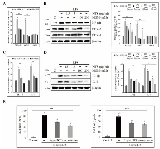 Sulfur compounds inhibited the LPS-induced NF-κB, COX-2, and proinflammatory cytokines. (A) Real-time PCR data of mRNA after treatment with 10 ng/mL LPS and 3 µg/mL NTS and 200 mM MSM for 48 h showing the relative expression levels of NF-κB, COX-1, and COX-2 normalized to GAPDH mRNA. *** p < 0.001 (ANOVA test). # The mean difference was significant at the 0.001 level. (B) Western blotting analysis in CCD-986Sk cells treated with 10 ng/mL LPS and NTS (1.5 and 3 ng/mL) or MSM (100 and 200 mM) for 48 h showing the expression of NF-κB, COX-1, and COX-2. The representative expression levels of proteins following NTS or MSM treatment were determined by densitometry and normalized to β-actin. Data are representative of three independent experiments. *** p < 0.001 (ANOVA test). # The mean difference was significant at the 0.001 level. (C) Real-time PCR data of mRNA after treatment with 10 ng/mL LPS and 3 µg/mL of NTS and 200 mM of MSM for 48 h showing the relative expression levels of IL-1β and IL-6 normalized to GAPDH mRNA. *** p < 0.001 (ANOVA test). # The mean difference was significant at the 0.001 level. (D) Western blotting analysis in CCD-986Sk cells treated with 10 ng/mL LPS and NTS (1.5 and 3 ng/mL) or MSM (100 and 200 mM) for 48 h showing the expression of IL-1β and IL-6. The representative expression levels of proteins following NTS or MSM treatment were determined by densitometry and normalized to β-actin. Data are representative of three independent experiments. *** p < 0.001 (ANOVA test). # The mean difference was significant at the 0.001 level. (E) ELISA analysis showing the inhibition of the LPS-induced expression of IL-1β and IL-6 by 3 µg/mL of NTS and 200 mM of MSM. Data are representative of three independent experiments. *** p < 0.001 (ANOVA test). # The mean difference was significant at the 0.001 level.