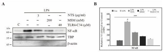 Sulfur compounds inhibited the LPS-induced nuclear accumulation of NF-κB. (A) Western blotting analysis of nuclear extracts harvested from CCD-986Sk cells treated with 3 µg/mL NTS or 200 mM MSM or 40 µM TLR4 inhibitor (TLR4-C34) for 48 h showing the inhibition of 10 ng/mL LPS-induced nuclear translocation of NF-κB. (B) Protein expression after NTS, MSM, and TLR4-C34 treatment were determined by densitometry and normalized to TBP. Data are representative of three independent experiments. *** p < 0.001 (ANOVA test). # The mean difference was significant at the 0.001 level.