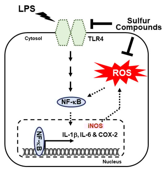 TLR4 is a transmembrane receptor that could activate inflammatory signals when a pathogen attacks. LPS treatment has also been shown to activate TLR4 as an inflammatory response [42,43]. We also found similar upregulation of TLR4 caused by LPS in CCD-986Sk cells. NTS and MSM inhibited LPS-induced TLR4 expression, which suggested the anti-inflammatory activity of these sulfur compounds. We analyzed the downstream targets of TLR4 and the mechanisms underlying the anti-inflammatory activity of sulfur compounds.