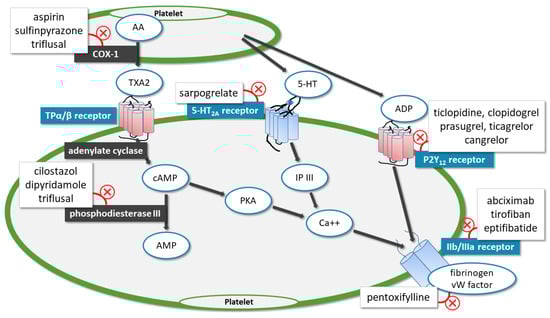 Sulfinpyrazone is a uricosuric medication used to treat gout and is also a non-selective COX inhibitor; thus, it inhibits degranulation of platelets and reduces the release of TXA2 (Figure 1). Candelise et al. randomized 124 patients and their study has not shown a significant difference in the efficacy of sulfinpyrazone and ASA []. In contrast, Barnet et al. failed to demonstrate its effectiveness, as it did not differ significantly from placebo []. Sulfinpyrazone was only tested in patients with TIA, and its utility is questionable.