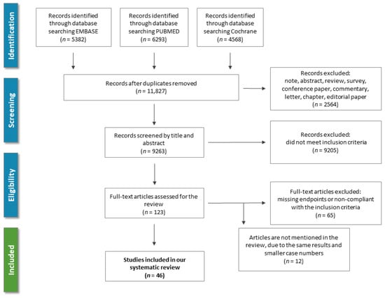 By the search, 11,827 records were identified and 123 potentially eligible articles were retrieved in full text (Figure 2). Overall, between 1969 and 2020, 46 RCTs comparing 10 antiplatelets including 6 combinations and 4 anticoagulants were included in our review.