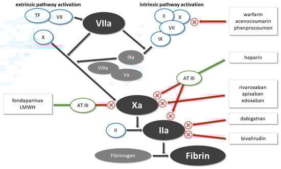 Rivaroxaban and dabigatran are directly acting oral anticoagulants; rivaroxaban inhibits the free factor Xa, and dabigatran is a direct thrombin inhibitor (Figure 3). In the New Approach Rivaroxaban Inhibition of Factor Xa in a Global Trial versus ASA to Prevent Embolism in Embolic Stroke of Undetermined Source (NAVIGATE ESUS) trial, 15 mg rivaroxaban was compared with 100 mg ASA in patients with recent non-cardioembolic IS. The trial was terminated prematurely, as rivaroxaban did not differ in the risk of stroke; nonetheless, the risk of major bleeding increased significantly in the rivaroxaban group []. In the Randomized, Double-Blind, Evaluation in Secondary Stroke Prevention Comparing the Efficacy and Safety of the Oral Thrombin Inhibitor Dabigatran Etexilate versus Acetylsalicylic Acid in Patients with Embolic Stroke of Undetermined Source (RE-SPECT ESUS) trial, 300 mg or 220 mg dabigatran was compared with 100 mg ASA. The results showed neither significant benefit in ischemic endpoint, nor a significant difference in major bleeding; however, more clinically relevant non-major bleeding occurred in the dabigatran group [].