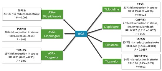 The following are available online at https://www.mdpi.com/article/10.3390/life11050447/s1, Table S1. Characteristics of included trials in our systematic review, Table S2. Clinical characteristics of the included patient populations. Table S3. Summary of the most representative studies comparing antithrombotic medications to aspirin.