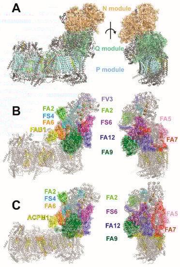 Functional modules of complex I and accessory subunits of the matrix arm. (A) The central subunits of complex I are assigned to functional modules for NADH oxidation (N module, orange), ubiquinone reduction (Q module, green), and proton pumping (P module, cyan). (B) Accessory subunits of the matrix arm of human complex I (PDB ID: 5xtd) are shown in color, all other subunits are shown in gray. (C) Accessory subunits of the matrix arm of Y. lipolytica complex I (PDB ID: 6rfr; color code as in (B)); the sulfur transferase subunit ST1 is not part of the model; note that FV3 is not present in Y. lipolytica complex I.