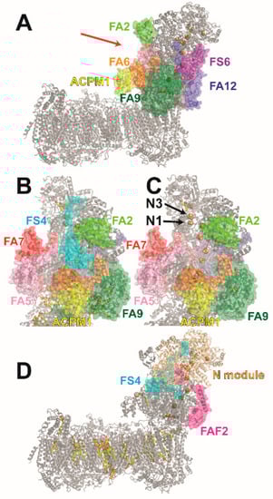 The three subunits NDUFS4, NDUFS6, and NDUFA12 are distinguished by the fact that they are already found in complex I from α proteobacteria []. NDUFS4 has attracted a lot of attention, because it is a hot spot for pathogenic mutations. Knock-out mouse models (Ndufs4 KO) are widely used to study Leigh syndrome (LS) [,]. Moreover, NDUFS4 can be singled out because, in mammalian species, it harbors a canonical serine phosphorylation site []. However, analysis of bovine complex I by mass spectrometry did not provide evidence for phosphorylation of the subunit [,]. Phosphorylation is thought to play an important role during import and/or maturation of the precursor protein [,]. NDUFS6 has a zinc binding site []. It is interesting to note that NDUFA12 is a paralog of assembly factor NDUFAF2 []. Several lines of evidence have indicated that the interplay of subunits NDUFS4, NDUFS6, and NDUFA12 with assembly factor NDUFAF2 is critical for the attachment of the N module to nascent complex I.