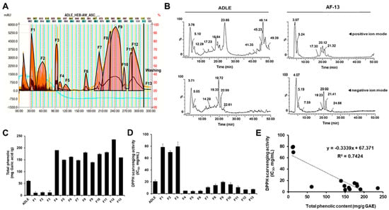 Correlation between total phenolic content and DPPH radical scavenging activity of fractions obtained after solvent fractionation of ADLE by gradient CPC. (A) Gradient CPC chromatogram of ADLE. (B) LC–MS chromatogram of ADLE and its fraction AF-13 in positive ion mode (top) and negative ion mode (bottom). (C) Total phenolic contents were expressed as mg of GAE/g of dry weight of fractions. (D) DPPH radical scavenging activity represented concentration of fractions required to inhibit 50% of the control calculated from linear regression equation. The final concentration of the DPPH radical was 98 µM. The concentration of each fraction was 1, 5, and 10 mg/mL. (E) Linear regression line between total phenolic content and DPPH radical scavenging activity of fractions. Coefficient of determination R2 = 0.74 (p < 0.05). Values are expressed as mean ± SD (n = 3).