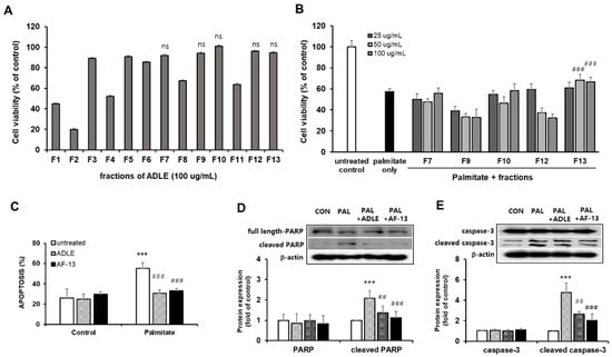 Effect of ADLE fractions on palmitate-induced cytotoxicity in INS-1 cells. (A) Effect of 13 fractions on the proliferation of INS-1 cells. Cells were incubated with fractions at 100 µg/mL for 24 h. (B) Palmitate (0.4 mM) was co-treated with the indicated concentration of fraction, and cell viability was determined at 24 h by MTT assay. (C) Quantification of apoptosis by fragmented DNA analysis using the Cell Death Detection ELISA kit. (D,E) Representative immunoblot and quantification of PARP and caspase-3. Data represent mean ± SD (n = 3–5). (Original western blot figure see Figure S1) CON: untreated control, PAL: 0.4mM palmitate-treated. Values are presented as mean ± SD from three independent experiments, normalized to the percentage of untreated control. *** p < 0.001 versus CON. ## p < 0.01, and ### p < 0.001 versus PAL. ns: no significance.