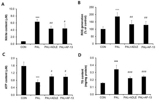 Because AF-13 treatment reduced palmitate-induced beta cell death, we evaluated the effect of AF-13 treatment on palmitate-stimulated nitrite, ROS, and TG accumulation and ATP levels and also compared the effect with ADLE treatment []. Palmitate treatment of INS-1 cells for 24 h resulted in a 9-fold (p < 0.001) increase in nitrite accumulation compared with the control (CON). AF-13 treatment significantly decreased the nitrite levels to 33.9% (p < 0.01) compared with palmitate (PAL) treatment, and this effect was similar to that with ADLE treatment (Figure 3A). Intracellular ROS levels were detected by DCF fluorescein-labeled dye in palmitate-treated cells in the absence or presence of AF-13. The amount of fluorescence intensity of ROS was significantly increased by palmitate treatment (1.9-fold, p < 0.001 vs. CON), but there was a reduction after treatment with 100 µg/mL of AF-13 or 500 µg/mL of ADLE (Figure 3B). Furthermore, intracellular ATP levels were reduced by palmitate treatment compared with the control (56.3%, p < 0.001 vs. CON), but the levels were significantly improved by AF-13 treatment (18.8%, p < 0.05 vs. PAL) (Figure 3C). Palmitate treatment also induced the accumulation of approximately 2.1-fold higher levels of intracellular TG than those in CON, which were attenuated by AF-13 co-treatment (Figure 3D). Similar results were observed on ATP levels and TG content with ADLE treatment (Figure 3C,D).