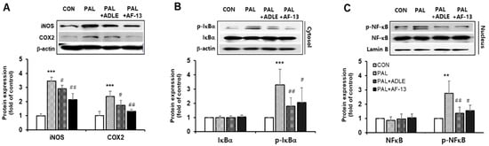 It has been reported that palmitate stimulates inducible nitric oxide synthase (iNOS) and cyclooxygenase-2 (COX-2) expression and that the upregulation of these proteins causes mitochondrial dysfunction in beta cells []. Therefore, we evaluated the effect of AF-13 treatment on palmitate-stimulated inflammation. Treatment with palmitate alone upregulated iNOS and COX-2 protein levels, whereas treatment with the compound AF-13 downregulated this effect (Figure 4A). We next examined whether AF-13 could inhibit the phosphorylation of IκB-α and translocation of NF-κB (active subunit p65) to the nucleus. Our results showed that cells treated with palmitate alone exhibited increased phosphorylation of IκB-α. However, palmitate-treated cells treated with AF-13 or ADLE exhibited a significant decrease in IκB-α phosphorylated protein levels (Figure 4B). Similar to the results obtained with IκB-α expression, palmitate treatment upregulated the protein levels of NF-κB p65 in the nuclear fraction, whereas the levels were significantly reduced by AF-13 or ADLE treatment (Figure 4C).
