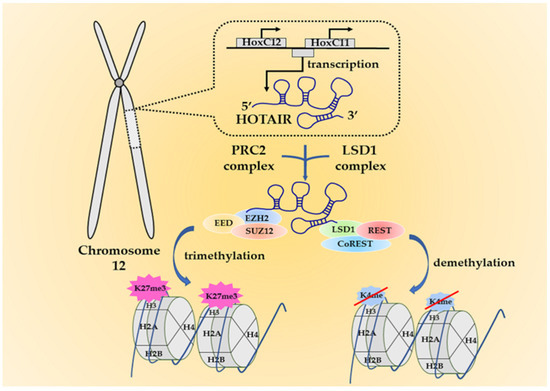 The origin of HOX transcript antisense intergenic RNA (HOTAIR) and its working mechanisms. HOTAIR is an anti-sense lncRNA that is transcribed from the HomeoboxC (HoxC) gene cluster at chromosome 12. It interacts with the polycomb repressive complex 2 (PRC2) complex at the 5′ end and the lysine-specific demethylase 1 (LSD1) complex at the 3′ end to exert the functions. The two complexes can respectively induce H3K27me3 or H3K4 demethylation. These epigenetic alterations eventually lead to gene silencing and may trigger oncogenesis.