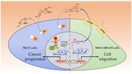 Estrogen/estrogen receptor (ER)-involved HOTAIR induction. E2 and endocrine disruptors (bisphenol-A (BPA); diethylstilbestrol (DES)) resemble in structure and both act on ERs in non-triple-negative breast cancer (TNBC) cells. ERs can bind to estrogen response elements (EREs) on the HOTAIR promoter and enhance its transcription, with the assistance of coactivators MLL and CBP/p300. HOTAIR induces H3K27me3 on targeted genes and propels cancer progression. Alternatively, in TNBC cells, Estradiol (E2) acts on GPERs to reduce miR-148 and increases HOTAIR levels. The HOTAIR-mediated trimethylation of specific genes triggers cell migration for further development.