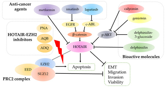 HOTAIR is the target of several sets of molecules. Anti-cancer agents (metformin, imatinib, and lapatinib) and bioactive molecules (calycosin, genistein, delphinidin, and delphinidin-3-glucoside) target and inhibit HOTAIR through multiple signal pathways. Consequently, HOTAIR ablation suppresses tumor progression by reversing epidermal-mesenchymal transition (EMT) and decreasing migration, invasion and viability, along with promoting apoptosis. HOTAIR-EZH2 inhibitors PNA, AQB, and ADQ can disrupt the interactions, thus blocking the binding of the PRC2 complex to HOTAIR, which eventually attenuate cancer development.