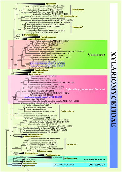 The subclass Xylariomycetidae has recently been updated to contain three orders (Amphisphaeriales, Delonicicolales, and Xylariales) and 35 families [3]. Recently, the family Induratiaceae was introduced in this subclass by Samarakoon et al. [4] with an updated phylogeny of Xylariales. Cainiaceae is a family of particular interest, as all members in this family tend to be found on monocotyledons, the majority of which are grasses [5]. In previous studies, Cainiaceae was accepted in the Xylariales [3,6]. Later, Hongsanan et al. [7], and Wijayawardene et al. [8] assigned Cainiaceae to the Xylariomycetidae as an incertae sedis family.