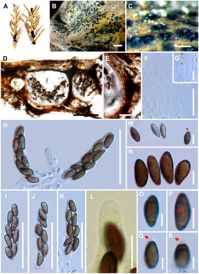 - Dai, D.Q.; Phookamsak, R.; Wijayawardene, N.N.; Li, W.J.; Bhat, D.J.; Xu, J.C.; Taylor, J.E.; Hyde, K.D.; Chukeatirote, E. Bambusicolous fungi. Fungal Divers. 2017, 82, 1–105. [Google Scholar] [CrossRef]