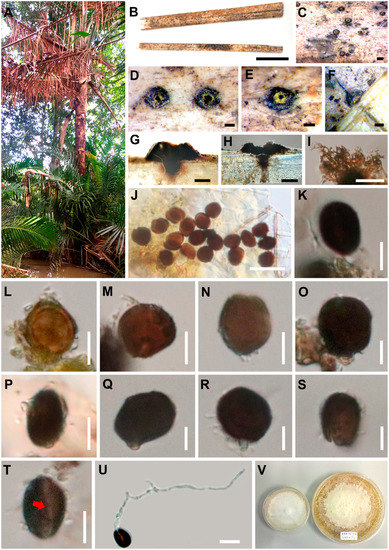 - Taylor, J.E.; Hyde, K.D. Microfungi of Tropical and Temperate Palms; Fungal Diversity Press: Hong Kong, China, 2003; pp. 1–459. [Google Scholar]