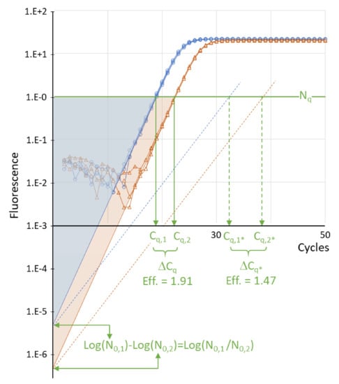 Definition of Cq and ΔCq. When amplification curves are plotted on a logarithmic fluorescence axis, the exponential phase, with a constant PCR efficiency, can be identified as the cycles where the fluorescence values are on a straight line (solid lines; Eff. = 1.91). The intercept of the downward extrapolated line with the Y-axis is the fluorescence associated with the starting concentration (N0). Setting a quantification threshold (Nq, horizontal green line) is used to determine the Cq value, defined as the number of amplification cycles needed to reach the threshold (vertical green arrows). The uniform blue and orange triangles, from N0 to Nq to Cq, illustrate that for two sets of reactions with about 10-fold different starting concentrations and the same PCR efficiency; the difference in Cq values is proportional to the difference in log(N0). Therefore, the difference in Cq values (ΔCq = Cq,1 - Cq,2) is proportional to the log of the starting concentration ratio (log(N0,2/N0,1). The dotted lines illustrate that the same ratio of N0 values and an assay with a lower PCR efficiency (Eff. = 1.47) lead to higher Cq values (Cq,1* and Cq,2*) and a larger ΔCq*. The graph is based on actual amplification data; the dotted lines represent a hypothetical less efficient assay.