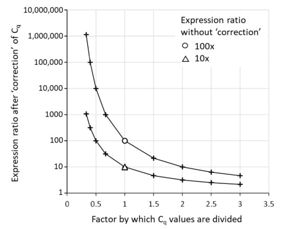 Some qPCR papers report gene expression ratios as the ratio of the observed Cq values [20]. Dividing the Cq value of target A by the Cq of target B is equivalent to dividing the logarithms of the starting concentrations of these two targets. Note, however, that the ratio of logarithms is not the same as the above discussed logarithm of their ratio. Even worse, the ratio of logarithms, as well as their product, has no mathematical or biological meaning. E.g., in reaction conditions where 10 copies in the reaction result in a Cq value of 35, a 10-fold difference in gene expression, 10 and 100 copies (Cq values 35.0 and 31.4 cycles, respectively), would give a Cq ratio of 0.897 (=31.4/35.0). Whereas, in similar conditions, reactions with 100 and 1000 copies (Cq values 31.4 and 27.8 cycles, respectively) would give a similar, but different, Cq ratio of 0.886 (=27.8/31.4). However, because there is no mathematical way to convert a Cq ratio into a gene expression ratio, this small difference cannot be interpreted as similar expression ratios. Statistical comparison of Cq ratios between samples would, therefore, also be meaningless. Calculating the ratio of two Cq values, or, similarly, dividing or multiplying Cq values with a certain factor, makes no sense, and should therefore never be used or reported in qPCR data analysis. Note that although the averaging of Cq values has biological meaning (see Section 4.1), the calculation of Cq variation involves multiplication and division, and, therefore, the reporting of Cq variation is never appropriate [2].